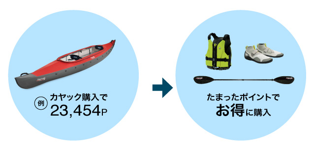 例えば、ボイジャー460T(#2341029)を購入した場合、23,454ポイント(ポイント利用なし、全額お支払いの場合)がたまります。1ポイント=1円としてご利用いただけるので、ライフジャケットやパドルなどの装備をそろえることができます。