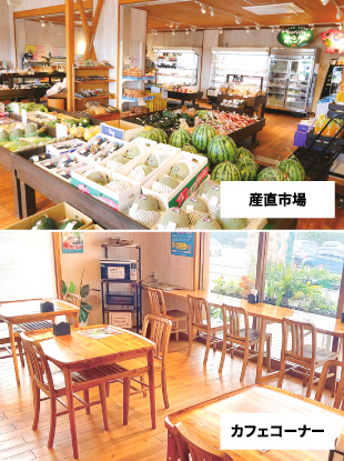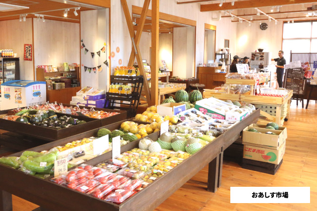 地域の特産品を販売する市場です。その日の朝に収穫した採れたての野菜や果物をはじめ、手作りのお菓子や工芸品なども見逃せません。イートインのカフェコーナーも併設しています。また、フレンドショップでもあり、モンベルクラブ会員さまはご優待を受けることができます。