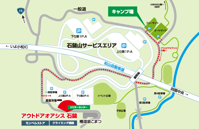 石鎚山SAから一般道へ下りることができません。キャンプ場をご利用の方は、いよ小松ICから一般道でお越しください。