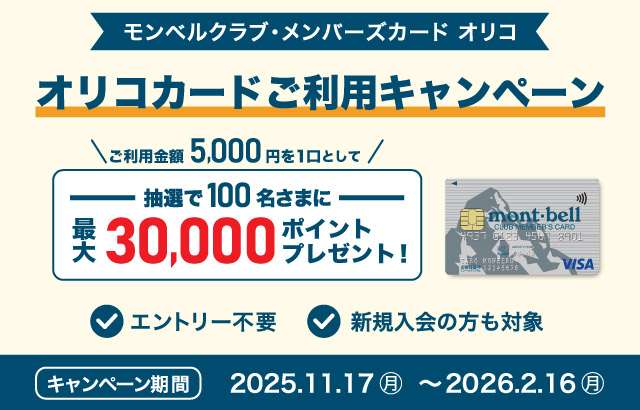 モンベルクラブ・メンバーズカード オリコ(オリコカード)をお持ちの方限定のキャンペーンを実施中! エントリーは不要。期間中にクレジットカードをご利用いただくと、ご利用合計金額5,000円(税込)を1口として、抽選で100名さまにモンベルポイントが当たります。