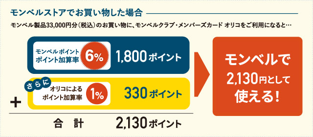 またモンベルストアでのお買い物なら、モンベルクラブのポイント加算(初年度6%)に加え、オリコによるポイント加算(1%)があります。