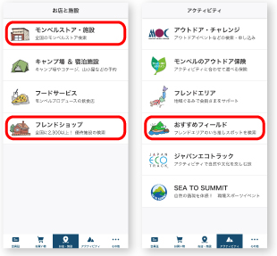 「お店と施設」タブの「モンベルストア・施設」「フレンドショップ」、または「アクティビティ」タブの「おすすめフィールド」をタップすると、お気に入りのアウトドアスポットをすぐに見つけられる地図検索が利用できます。