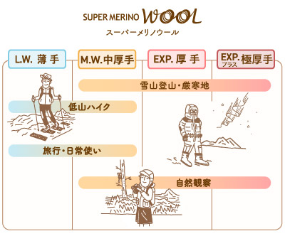 M.W.(中厚手)…適度な保温力と優れた吸水拡散性で肌をドライにキープ。登山やツアースキーなど、速乾性と保温性が必要な活動に適しています。