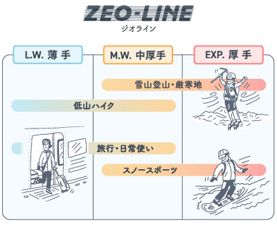 EXP.(厚手)…厳寒地での着用にも対応する高い保温性を備えています。ふっくらとした空気層が暖かさを逃さない独自構造。