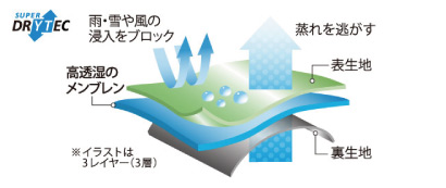 雪や風の侵入を防ぎ、汗などの水蒸気は外に逃がす防水透湿性素材を使用しています。雪による濡れや冷たい風をシャットアウトすると同時に、衣服内にこもった汗や水蒸気を素早く放出し、汗冷えを防ぎます。モンベル独自の防水透湿性素材「スーパードライテック」、「ドライテック」を使用したモデルや、高い防水透湿性を持つ「ゴアテックス」、「ウインドストッパー ファブリクス バイ ゴアテックス ラボ」を使用したモデルをラインアップしています。