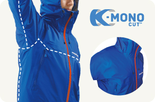 バックパックの負荷がかかる肩周りなどの縫製箇所を極限まで減らし、高次元の防水性・軽量性を実現。シンプルな構成ながら、腕上げなどの動きやすさも追求しています。