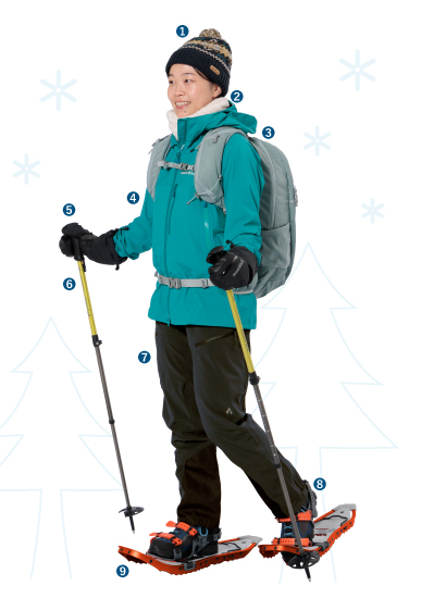 【モデル着用ウエア】❶ジャカード ニットキャップ #1 /❷ クリマエア ネックゲーター/❸ヌプリパック 25 Women's/❹プモリパーカ Women's/❺パウダー ジップミトンWomen's/❻アルパインポール カムロック ドライグリップ S/❼アルパインパンツ Women's /❽アルパインクルーザー800 Women's/❾アルパイン スノーシュー 56