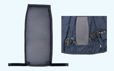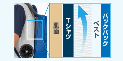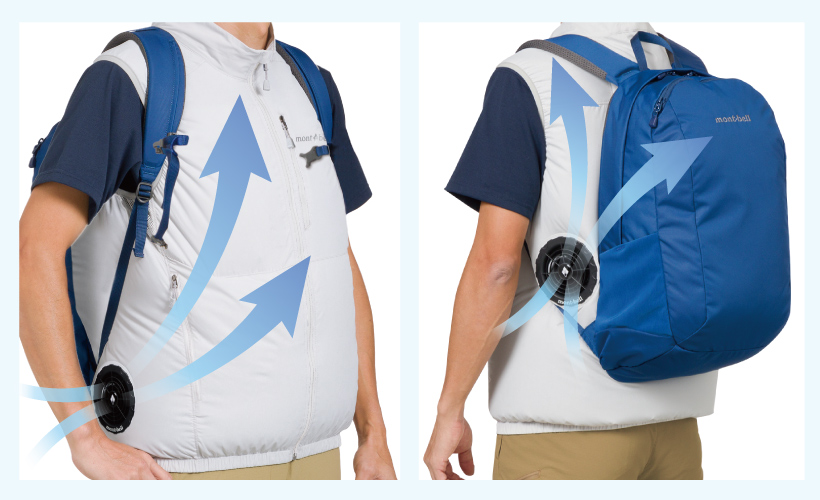 小型のバックパックを背負った時に、空気の流れを妨げにくい位置にファンを配置した独自の構造。左側のファンは背中側、右側のファンは体の前面と、異なる方向に風を生み、効果的に空気を送ることができます。