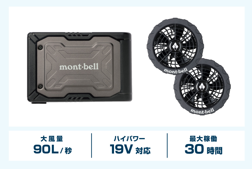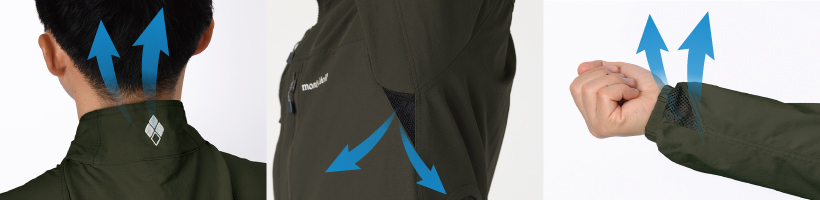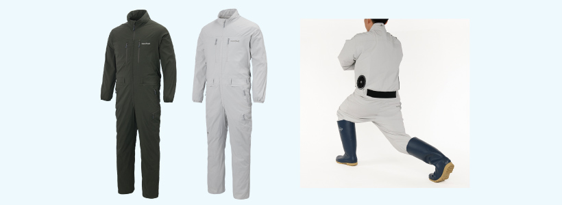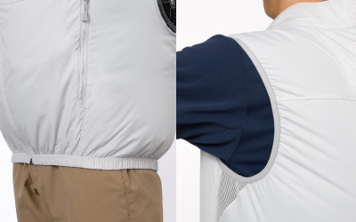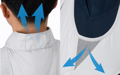 ファンから取り込まれた空気が効率よくウエア内を通り抜ける構造で、効果的に汗を気化させます。登山などのアウトドア・アクティビティはもちろん、暑い時期の野外作業でも役に立つ、暑さ対策の強い味方です。