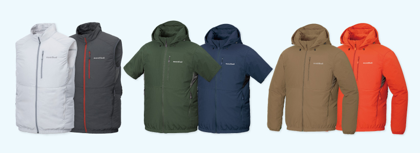 70デニールの生地のスタンダードモデル。ベストとパーカをラインアップしています。パーカには取り外し可能なフードが付き、被ることで日差しを遮りながら、頭部にも風が通るようになります。