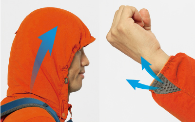 フードを被ることで日差しを遮りながら、頭部まで風が通ります。長袖の袖口にはメッシュのパーツがついており、袖口からも風が抜けます。