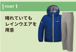 雨に備えて上下に分かれたレインウエアが必要です。防水透湿性に優れた本格的なゴアテックス製のウエアをはじめ、多数ラインアップ。