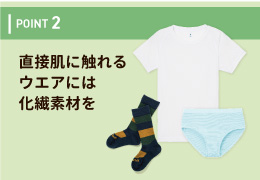 アンダーウエアの選択はとても重要です。吸水拡散性を持ち、汗冷えしにくいウエアを選びましょう。暑い時は、Tシャツ一枚でもOK。