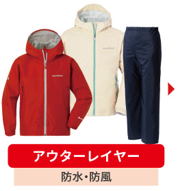 雨や風を防ぐレインウエアやウインドシェルなど、雨や風から体を守るためのレイヤー。ジッパーの開閉で体温調節や蒸れの解消もできます。