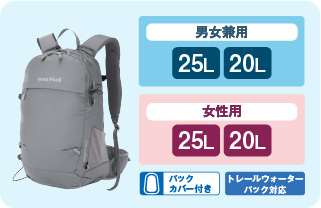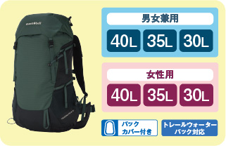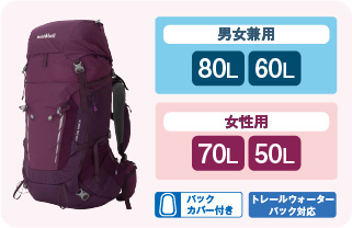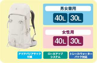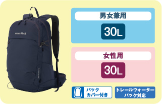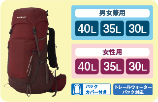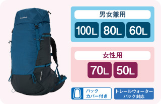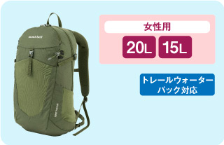 女性や小柄な方には女性用モデルがおすすめです。レギュラーモデルの機能はそのままに、女性の体にフィットするようにショルダーハーネスやバックパネル、ヒップベルトをデザインしています。身長145~165cmくらいまでの方に適したサイズです。