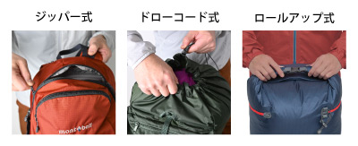 ジッパーによる開閉で最も簡単にアクセスできます。小型パックに多く採用しています。