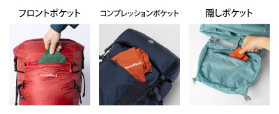 バックパックには、山で快適に行動するためのさまざまな機能が盛り込まれています。本体には耐久性に優れた生地を、体に触れる背面部には汗をかいても乾きやすい素材を使用しています。また重い荷物をバランスよく背負うために、ヒップベルトやスタビライザーテープなどを搭載しています。