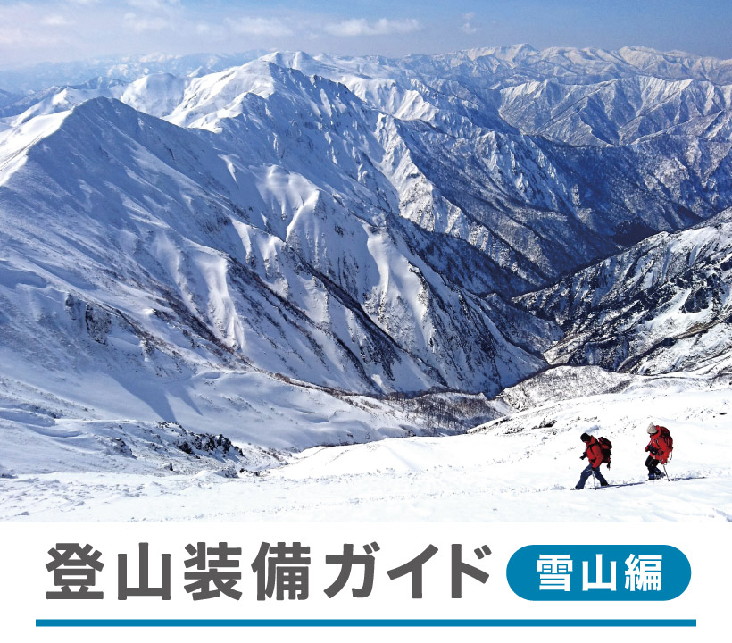 凍り付いた雪面や岩稜帯を歩く雪山登山では雪山用登山靴に10本爪以上のアイゼン、ピッケル、ヘルメットが基本装備です。雪崩などの緊急時の備えも忘れずに。