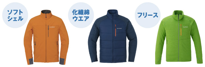 空気の層を作り、保温性を確保するミドルレイヤー。ソフトシェル、化繊綿のウエア、フリースなどから選べます。気温や体感温度に合わせて脱ぎ着して、快適な状態を保ちます。