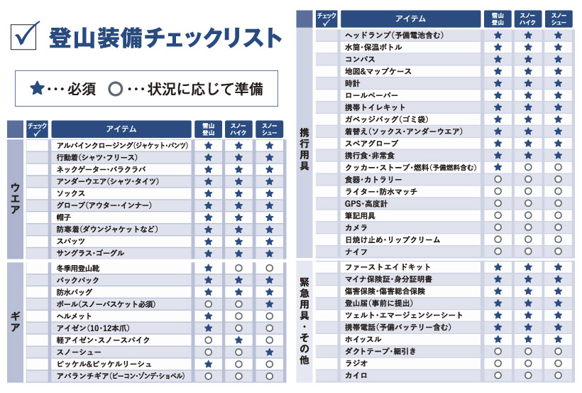 さまざまな楽しみ方のできる雪山ですが、無雪期と比べて山の状況が過酷なので、それに対応できる技術も必要になります。念入りに準備して万全の装備で雪山へ出かけましょう。