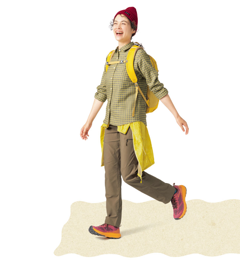 中厚手のメリノウールの山シャツは、体温調節が難しい秋の低山で重宝する。腰に巻いた、防風はっ水機能のある軽量コンパクトなウインドブレーカーとうまく使い分けて。イエローやベージュなどの秋らしいカラーを中心に、赤いニット帽をアクセントとして。