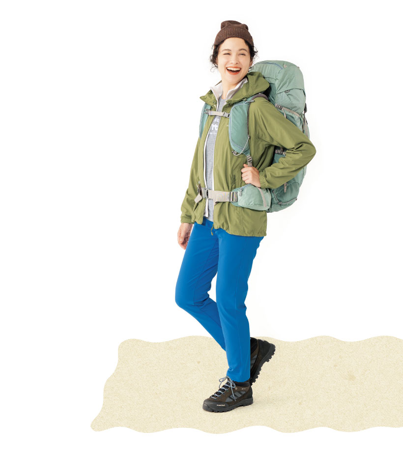 細かい体温調節が必要になる山小屋泊登山では、よりレイヤリングを意識して。化学繊維の長袖Tシャツに、アウターとしても使える薄手のフリースとウインドブレーカーを重ね着。カラーリングの主役にはパンツの鮮やかなブルーを!