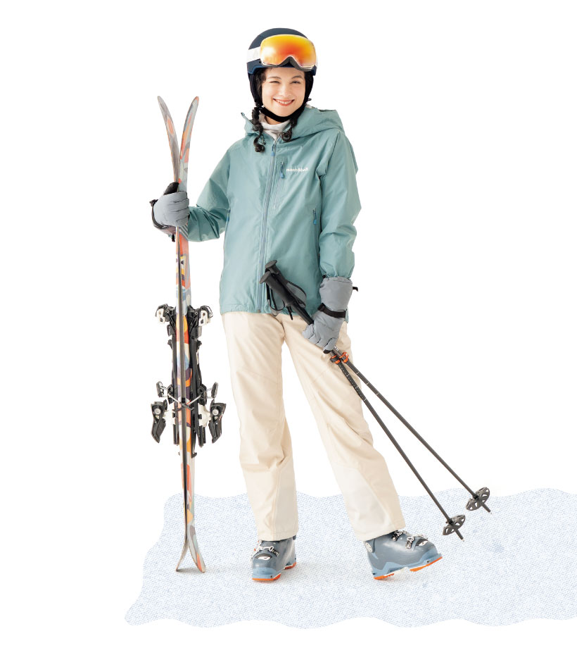 スノースポーツのときは、やっぱり専用ウエアやギアを選ぶのが快適。保温性、防水透湿性、防風性を備えた素材を使用しているうえ、雪面で滑りにくい生地加工や、雪の浸入を防ぐウインドスカートなどの機能も満載。ブルーグリーンのニュアンスカラーが新鮮!