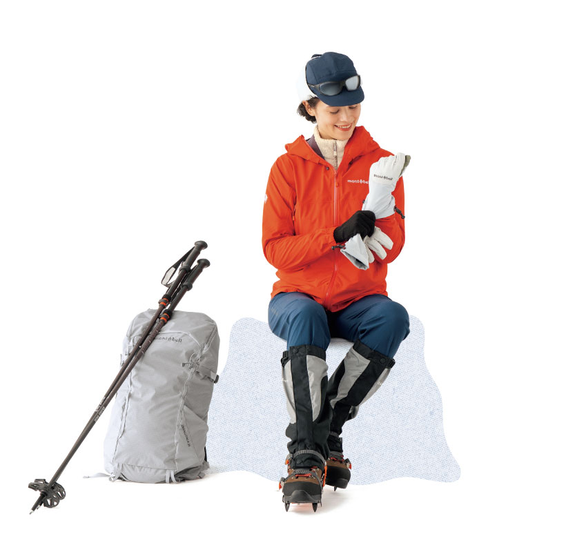 雪山登山に選ぶアウターは、ストレッチ性に優れ、ウエア内を常に快適に保つことのできる防水透湿性素材のものがおすすめ。レイヤリングは、保温性の高いフリースを中間着に選び、着脱することで体温調節を。雪山で目立つカラーは、安全面でも◎。