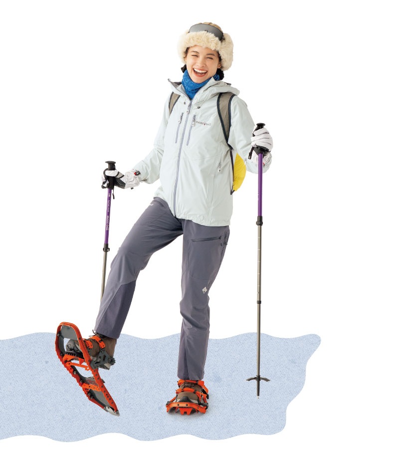 旅先などで気軽にスノーシューを楽しみたいときには、着用シーンに合わせてインナーを着脱することができる、スノーウエアが一枚あると重宝。防水・防寒仕様の中綿入りシューズも、雪山だけでなく雪国での旅行にも使える。モノトーンコーデで小物を差し色に!