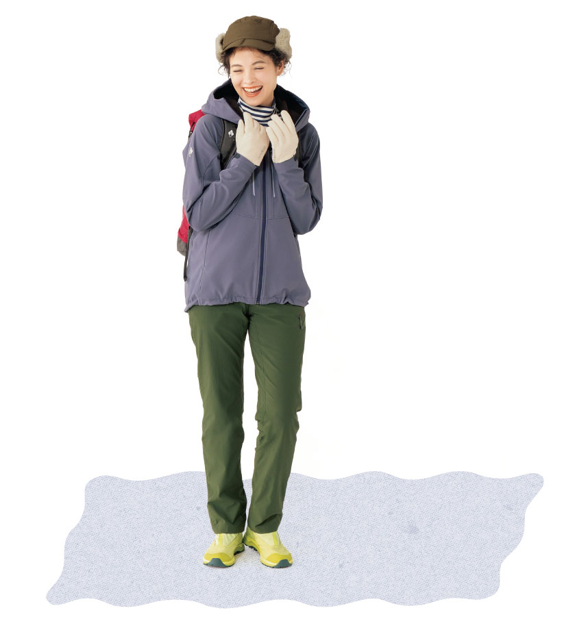 行動中に寒くなりそうな場合は、防風・保温だけでなく、ストレッチ性や通気性も備えたソフトシェルジャケットが活躍。インナーには保温性と速乾性を兼備したメリノウールプラスを。全身を落ち着いたカラーでまとめつつ、小物を差し色にした上級者コーデ。