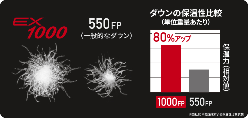 モンベルの「EXダウン」は厳冬期の冷え込みが厳しく、寒暖差の激しい自然環境で育てられた水鳥から採取されるダウンのみを使用。一般的なダウンよりひときわダウンボールが大きく、小羽枝の密度が高いため、熱の移動を遮断するデッドエアを多く蓄えることができます。その中でもダウンボールが一番大きく、わずかな綿量でも極めて高い保温力を発揮するのが1000FP・EXダウンです。一般的な550FPダウンと比べ、約半分のダウン量で同等の暖かさを得られるため、製品の軽量コンパクト化に寄与します。