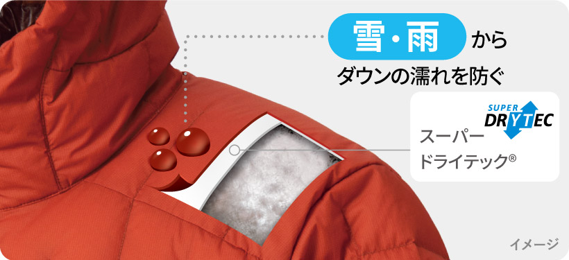 外からの冷気の侵入と、ウエア内の暖まった空気の放出を防ぎ、高い保温効果を発揮。優れた透湿性によりウエア内の蒸れを逃がし、活動中の快適性を保ちます。ダウンの濡れも抑えることができ、ダウン本来のロフト(かさ高さ)をキープし、暖かさが持続します。生地表面には水分の多い雪や雨をはじく耐久はっ水加工を施しています。