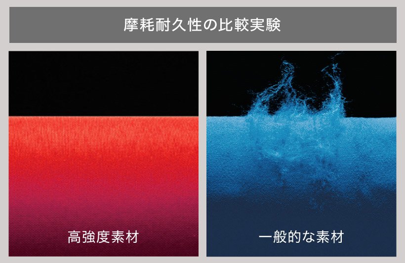 表地には、滑らかな長繊維にねじりを加え、小さなクリンプ(縮れ)を持たせた繊維を使用。繊維一本一本のねじれがもたらす生地表面の微細なシワが、雪面での滑り止め(アンチグリース)性能を発揮します。表面にけば立ちがないため、雪が付着しにくいのも特長です。