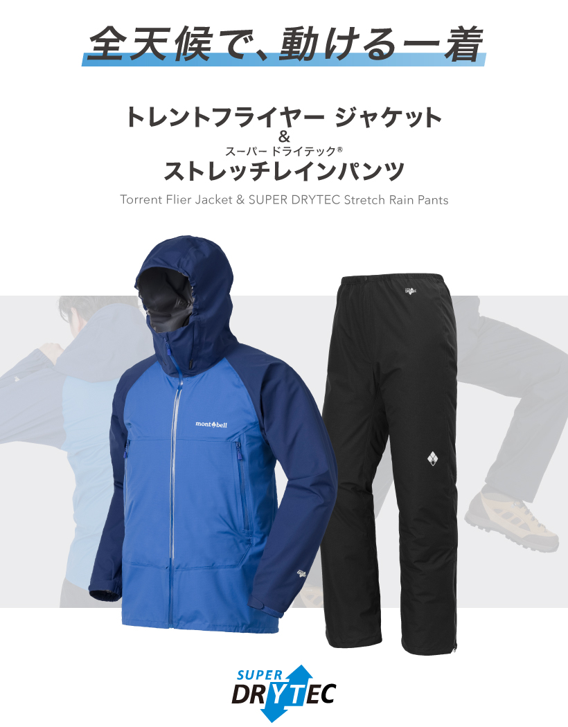 高い透湿性と優れたストレッチ性を備えたオールウエザー(全天候型)クロージングの最新モデル「トレントフライヤー ジャケット」と「スーパードライテックストレッチレインパンツ」。軽く、しなやかで動きやすく、運動量の多いアクティビティにおすすめのアイテムです。