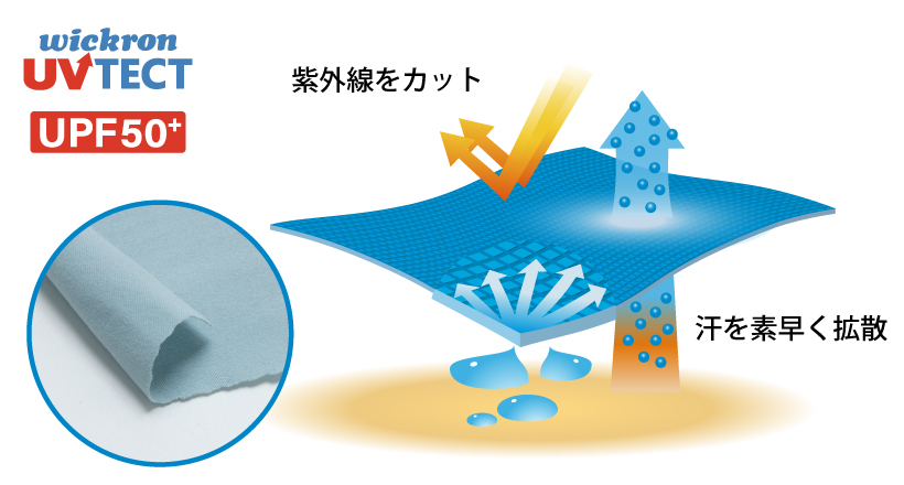 ウィックロンUVテクトの紫外線保護指数は最高レベルのUPF50+で、効果的に日焼けを防ぎます。UPFとはUltraviolet Protection Factor(紫外線保護指数)の略称で、衣類が紫外線を防ぐ効果を示す指標です。UPF50は衣類を着用することで、未着用時に比べて日焼けをする時間を50倍以上遅らせるということを示します。