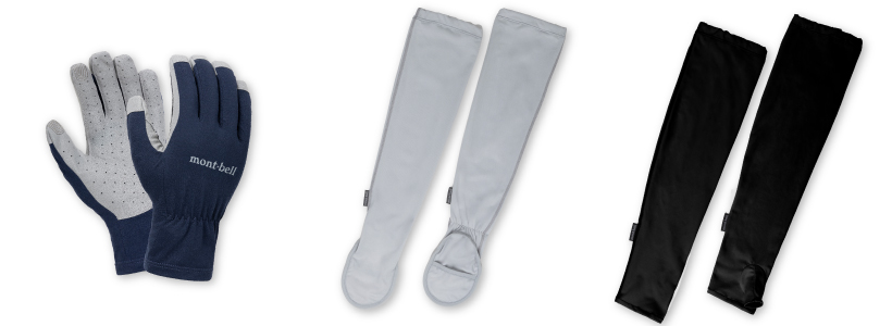疎かになりがちな手の紫外線対策。手だけ日焼けしてしまった経験は誰にでもあるはず。活動中はグローブの着用をおすすめします。アームカバーは半袖Tシャツと合わせて腕の紫外線対策に有効です。