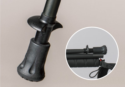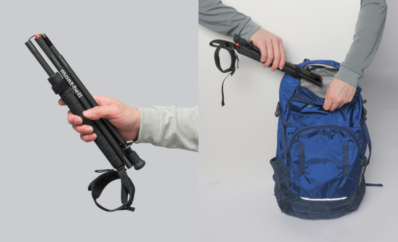 4本継ぎのため、収納時はデイパックにも収められるほどコンパクトに折りたたむことができます。また、折りたたんだシャフトをまとめるためのバンドも備えています。バックパックのメイン気室やサイドポケットへスムーズに出し入れが可能です。
