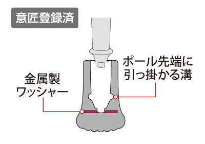 内側に溝を設け、ポールの先端が引っ掛かる独自の構造で脱落しにくい仕様(意匠登録済)。また、先端部分に金属製ワッシャーを内蔵することで耐久性も向上しています。