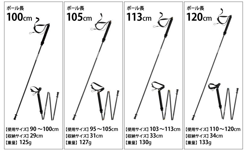 軽さと剛性に優れるカーボン繊維強化樹脂を使用した、トレイルランニングやスピードハイクなどにぴったりの、超軽量トレッキングポールです。4サイズ展開で身長に合わせて適切な長さをお選びいただけます。